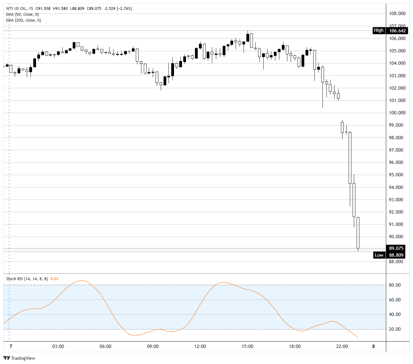 WTI原油价格周二从106美元以上暴跌至90美元以下,此前特朗普总统宣布暂停对伊朗的军事行动两周,尽管市场在整个交易时段已开始抛售原油,因交易员押注他会在GMT00:00周三的最后期限前退让 标题:WTI 原油跌破 90 美元,因特朗普暂停对伊朗的打击,但能否持续?