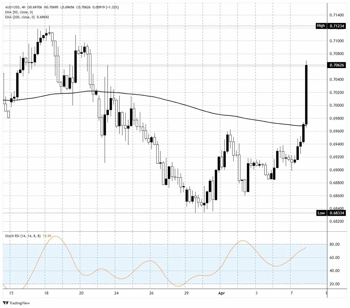 周二,澳元/美元大涨逾1.3%,从约0.6970反弹至接近0.7060的水平收盘。此举伴随着风险偏好的强劲回归,此前特朗普宣布对伊朗的军事行动暂停两周,WTI原油价格从106美元以上暴跌至90美元以下。该货币对重新站上四小时图上的关键移动平均线,并录得数周来最强单日涨幅。 标题:澳元/美元飙升突破0.7050,特朗普暂停对伊朗的打击两周