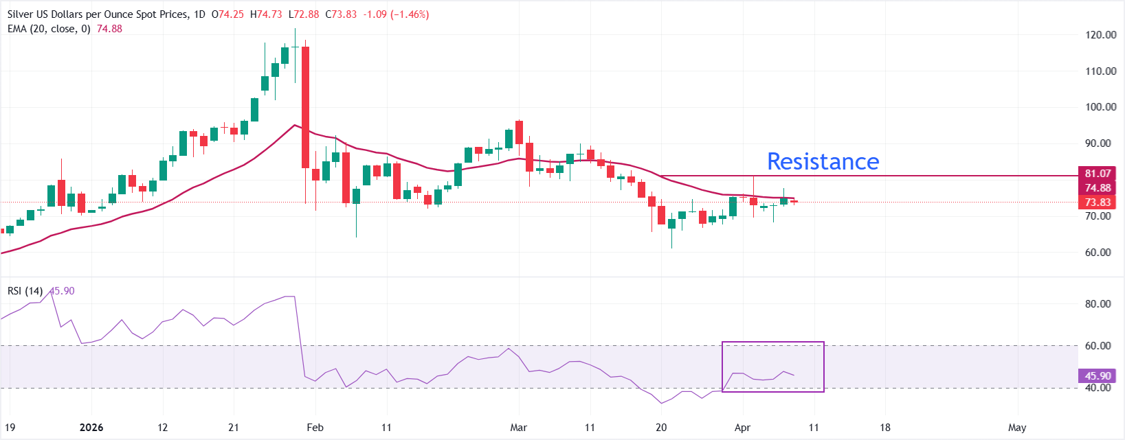 银价(白银/美元)在周四亚洲时段尾盘平稳交投于74.00美元附近。由于周六美国与伊朗在巴基斯坦就永久停火第一轮谈判的不确定性,白银在方向上表现挣扎。 标题:白银价格预测:白银/美元在美国-伊朗会谈前持平,徘徊于74美元附近