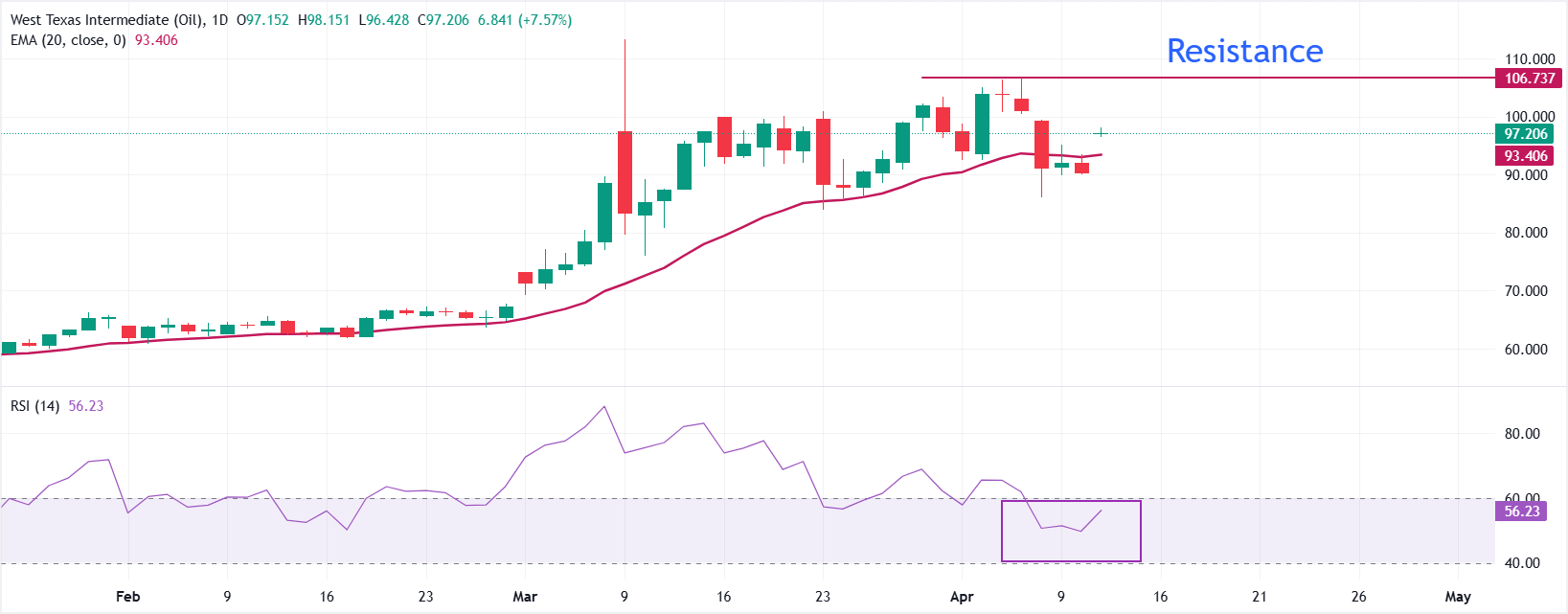 纽约商品交易所(NYMEX)西得克萨斯中质油(WTI)期货周一亚市交易上涨7.6%,至98.00美元附近 标题:WTI 价格预测:特朗普意图封锁霍尔木兹,WTI 反弹至 98 美元