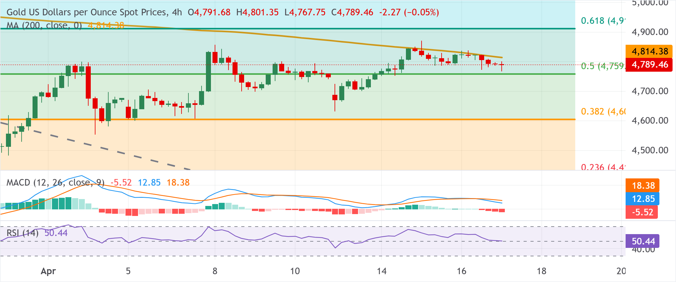 黄金(黄金/美元)在周五亚洲时段延续横盘整理走势,目前交投于4800美元附近,全天几乎持平,因市场信号喜忧参半。 标题:黄金交易员似乎态度不明,因为霍尔木兹风险抵消了对伊朗外交的希望