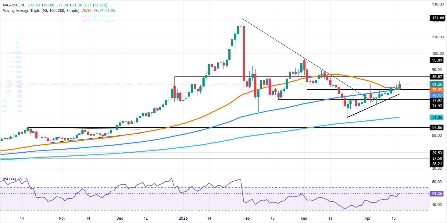 银价(白银/美元)周五飙升超过4%,收复至每盎司81.00美元,因美元在中东冲突利好消息影响下遭受重创。 标题:白银价格预测:看涨,有望收于81美元以上