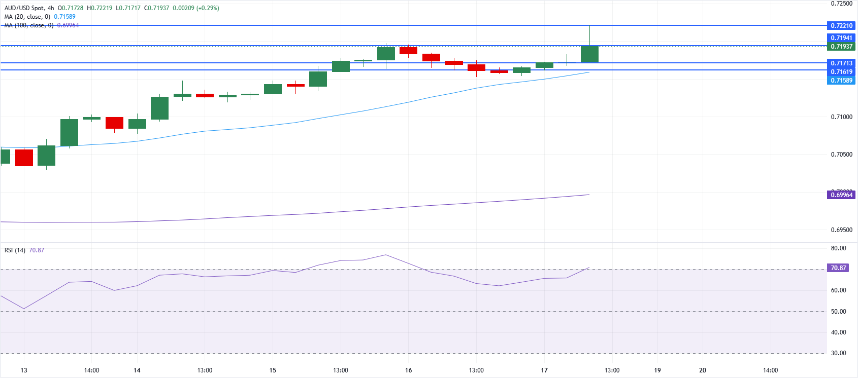 澳元/美元周五飙升至0.7200价格区间附近,中东局势好转的消息打压美元(USD),支撑了澳元(AUD)等风险敏感货币。 标题:澳元/美元上涨,霍尔木兹海峡重新开放缓解油价冲击担忧,风险情绪改善