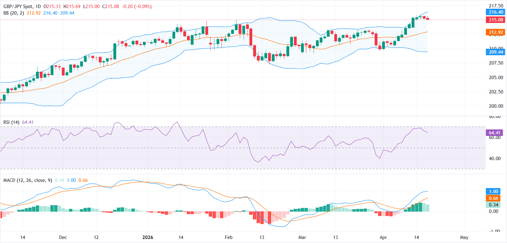 周五,英镑/日元在相对平静的市场环境中呈现轻微下行偏向,随着市场对美伊和平协议潜在达成的预期升温,油价承压,日元相较英镑表现略优。截至发稿时,该货币对交投于215.05附近,较日内高点215.69有所回落。 标题:英镑/日元下跌,因伊朗重新开放霍尔木兹海峡、油价暴跌