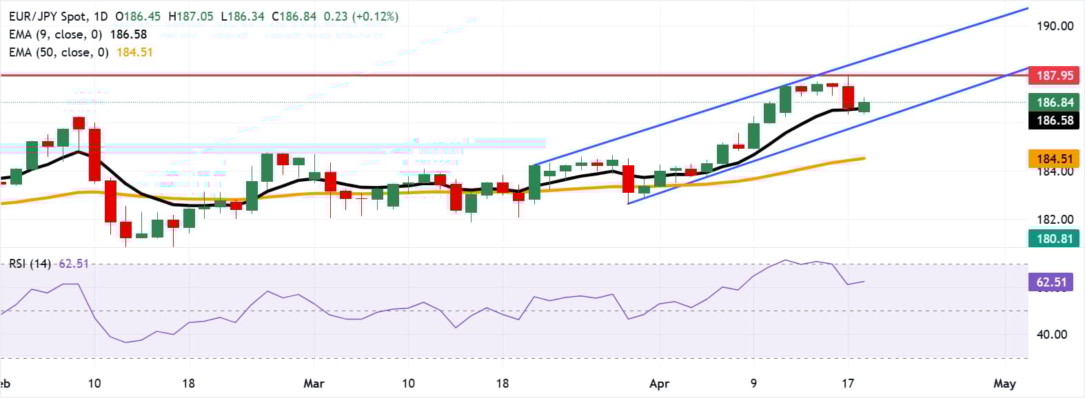 欧元/日元在前一交易日录得近0.5%的跌幅后回升,周一亚洲时段徘徊于186.80附近。日线图的技术分析显示,该货币对在上升通道内呈上行趋势,显示出持续的看涨偏向。 标题:欧元/日元价格预测:在看涨偏向保持的情况下测试187.00阻力位