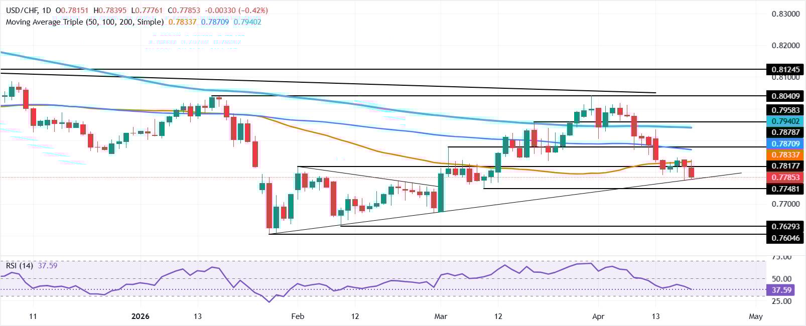 美元/瑞郎周一在突破0.7828的50日简单移动均线(SMA)后,测试趋势线上的关键支撑位,这加剧了对0.7800的突破,目前正测试上周的低点0.7775。 标题:美元/瑞郎价格预测:跌破0.7800延续下行趋势