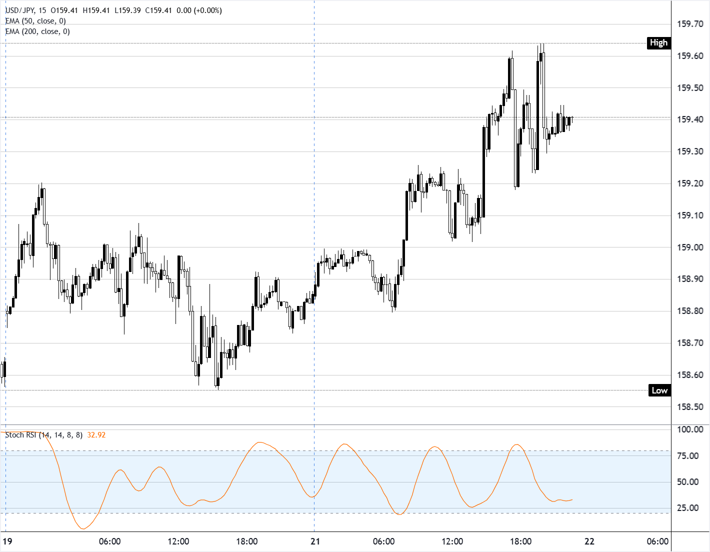 美元/日元周二上涨0.37%,在美国交易时段最高触及159.65后,收于159.40附近。过去几个交易日内,价格在大约158.55至159.65区间内震荡,重叠交易时段出现方向性波动,而在较为清淡的时段则形成更紧凑的小实体K线。 标题:美元/日元攀升,因日元在伊朗最后期限引发的风险偏好反应中表现落后