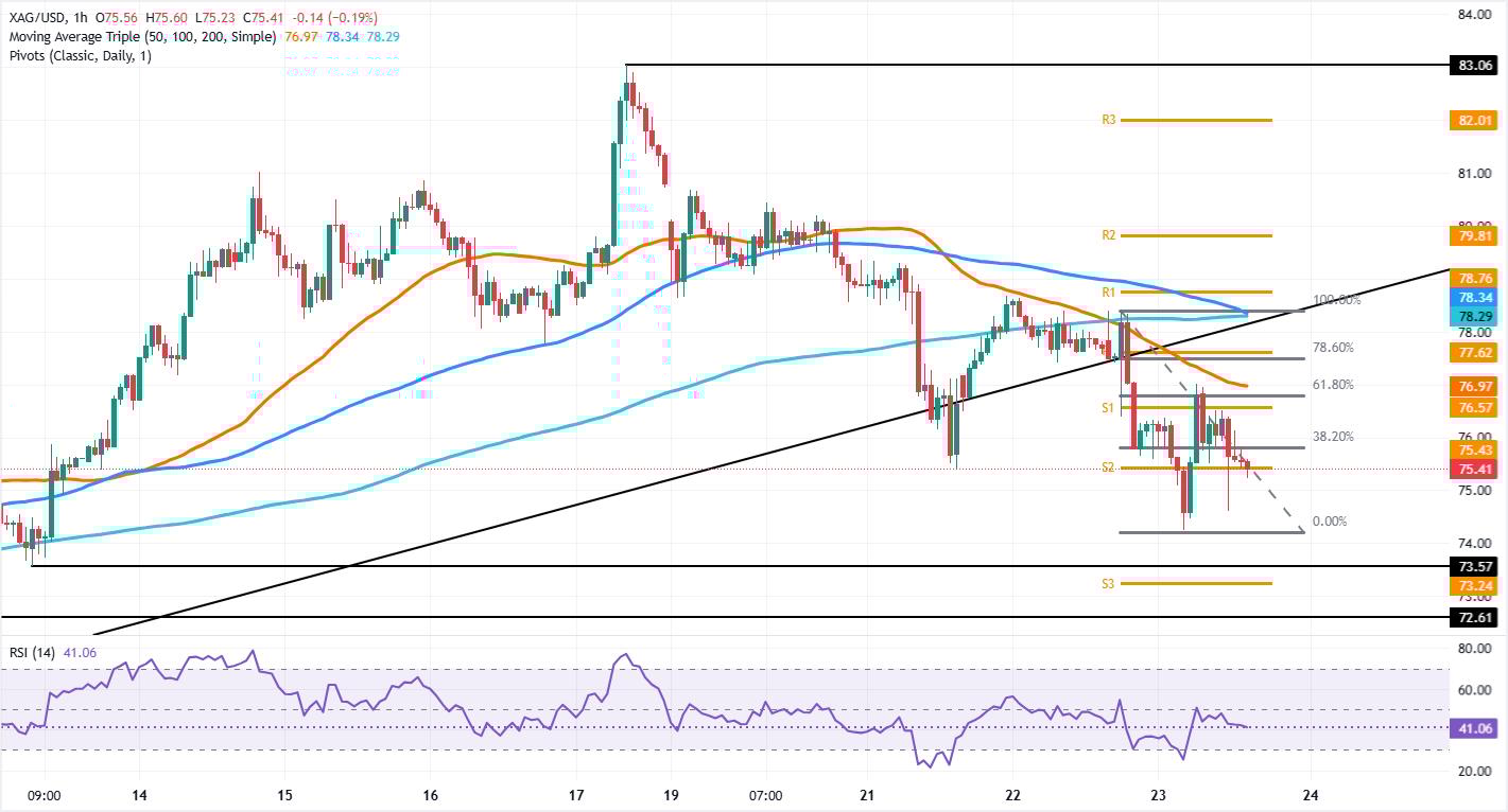 由于地缘政治新闻主导周四的价格走势,银价买盘(XAG/USD)在50日简单移动均线(SMA)78.73美元处受阻后暴跌。XAG/USD报75.40美元,下跌3%。 标题:白银价格反转,空头吞没形态暗示进一步下跌