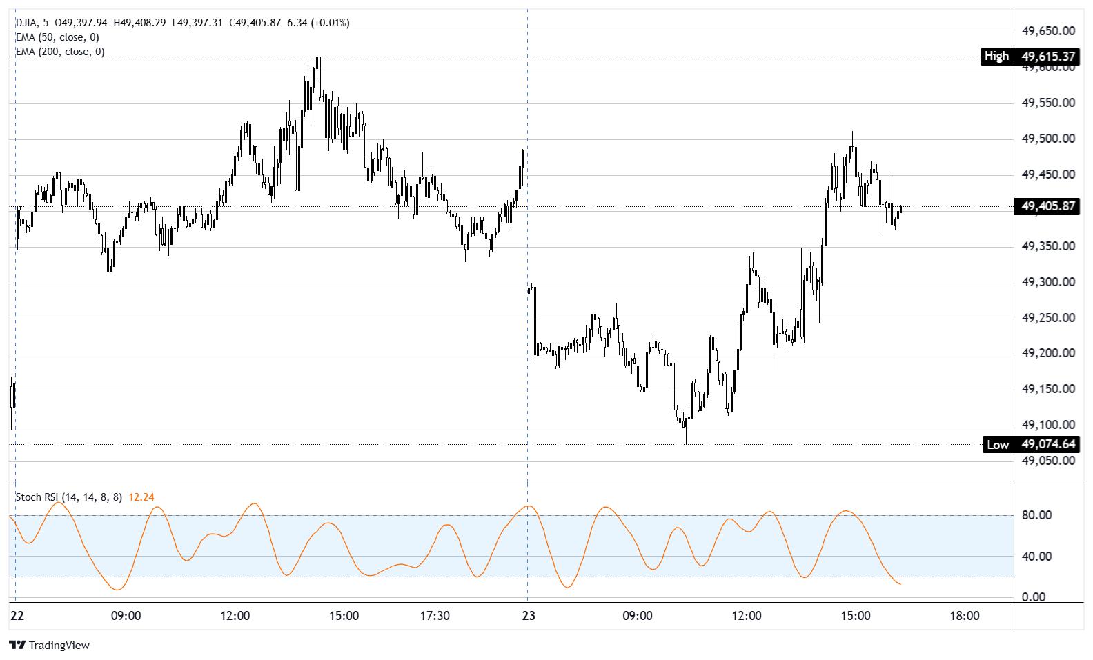 道琼斯工业平均指数(DJIA)期货周四徘徊在49,400附近,盘中在49,100至49,600之间波动后,现交易略低于平盘线。 标题:道琼斯工业平均指数持平,半导体板块延续创纪录涨势