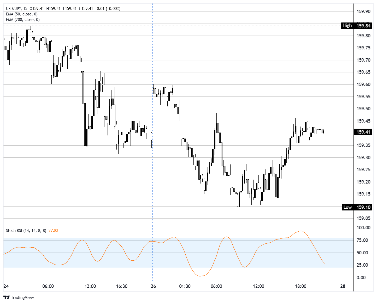 美元/日元周一基本保持不变,与周五的收盘报价接近159.40,在159.10至159.85之间的75点窄幅区间内波动。该交易时段产生了一系列小实体蜡烛,反映出在周二日本央行(BoJ)决议前的不确定性 标题:美元/日元在日本央行(BoJ)和美联储(Fed)双重政策周前徘徊不前