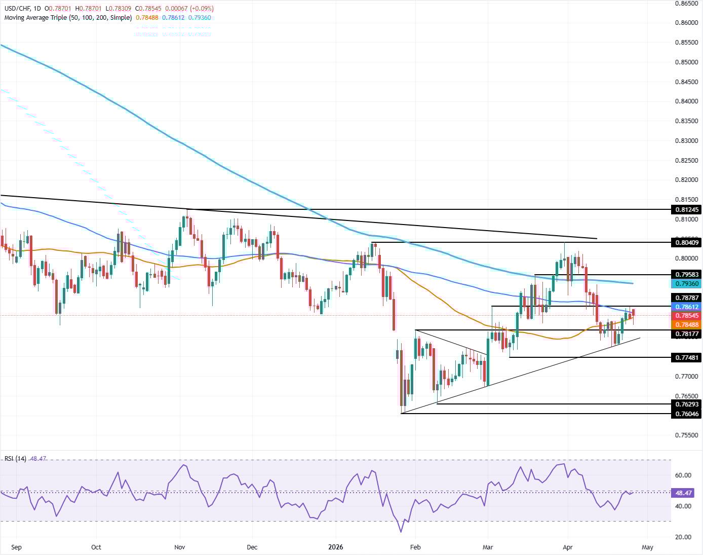 美元/瑞郎周一小幅走高,上涨约0.15%,因美元(USD)从日内低点反弹,北美时段风险偏好改善。撰写时,该货币对交投于0.7854。 标题:美元/瑞郎价格预测:美元接近100日均线,动能在阻力位附近增强