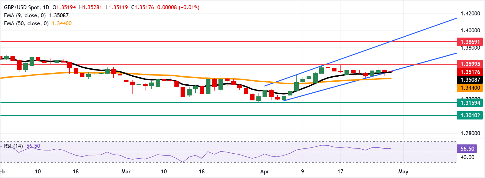 英镑/美元在前一日小幅下跌后微幅走高,周三亚洲时段交投于1.3520附近。 标题:英镑/美元价格预测:徘徊于接近1.3500的九日EMA附近