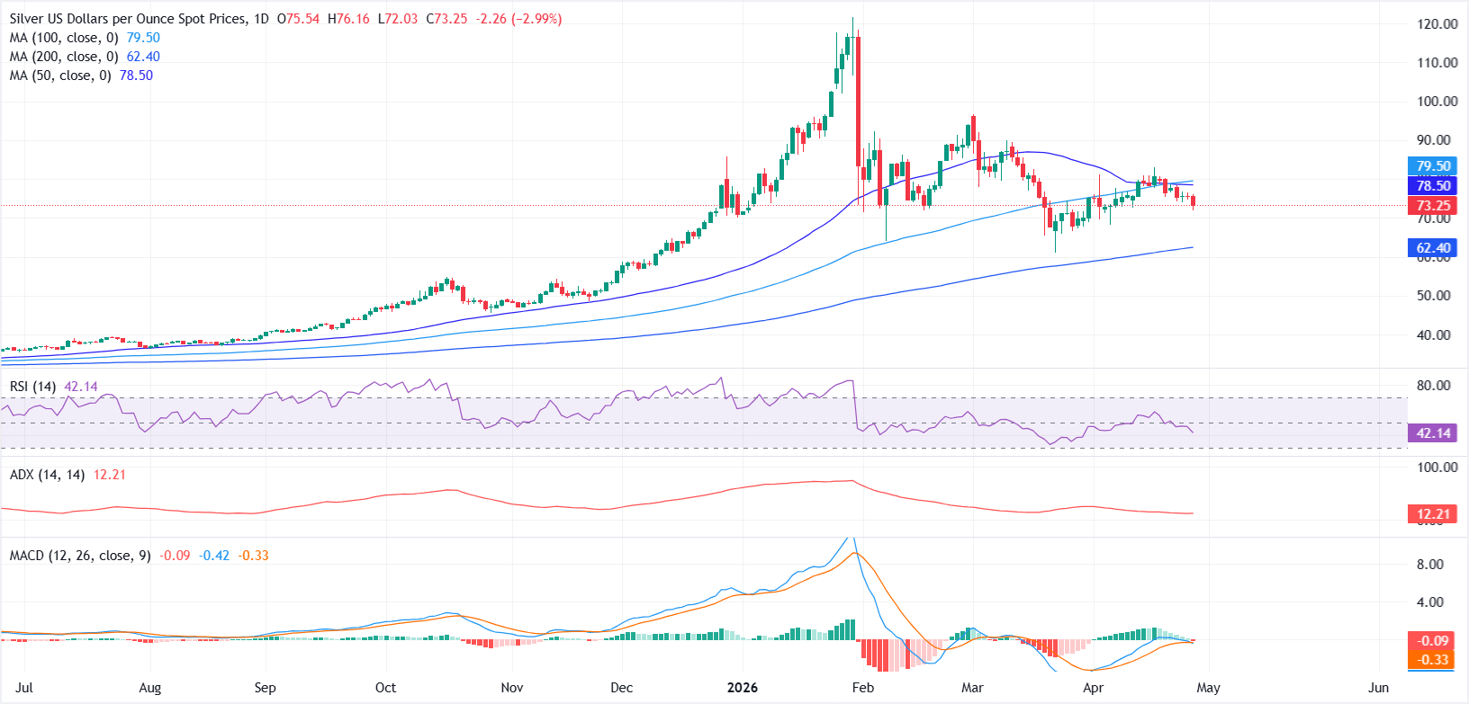 银价(白银/美元)周二偏向下行,跌幅超过2.5%,因“利率维持高位更长时间”的预期持续对价格走势构成压力。 标题:白银价格预测:白银/美元在均线下方挣扎,空头动能增强