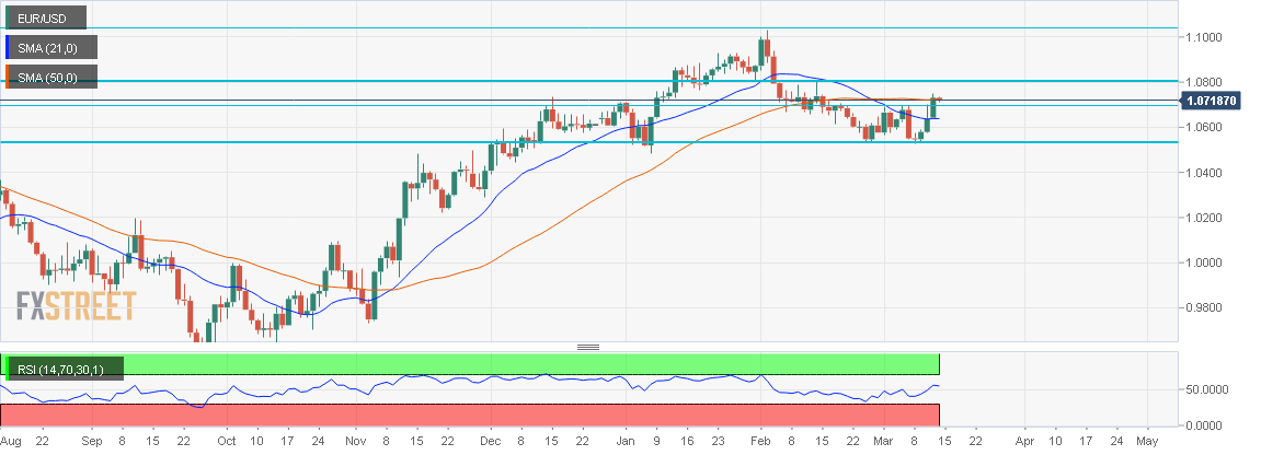 发稿时,欧元/美元正徘徊于50日移动均线(DMA)附近,该水平目前处在1.0727附近,阻止汇价进一步上涨。