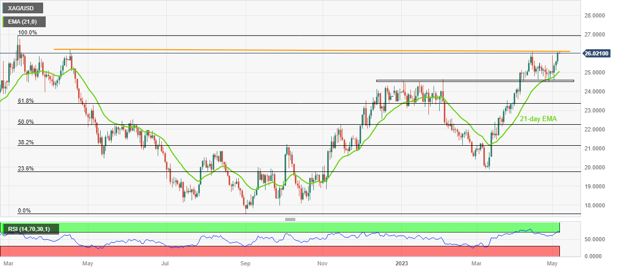周五早些时候,银价小幅上涨至26美元附近,多头在2022年 标题:银价分析:白银/美元在26美元附近刷新13个月高点,即便RSI超买