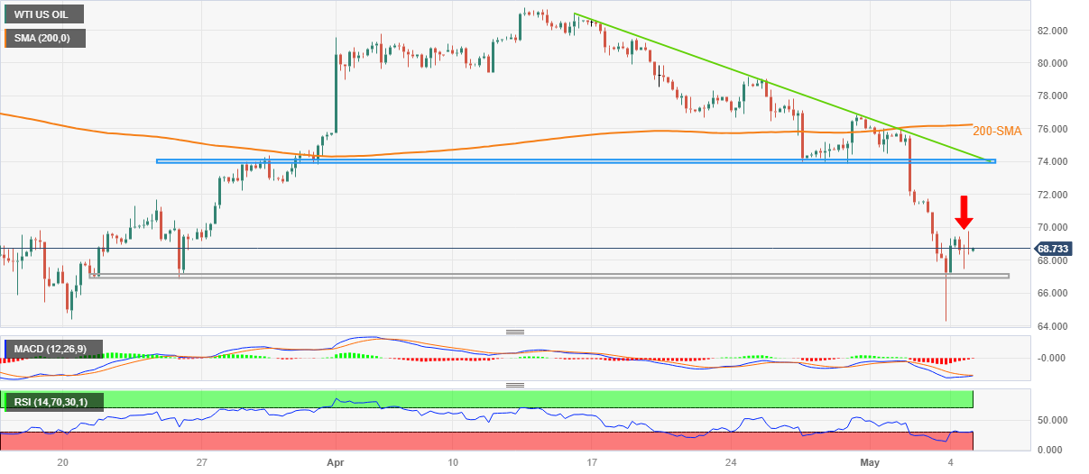 WTI油价温和上涨于68.70美元附近,前日WTI油价大幅波动最初油价跌至2021年12月以来的最低水平,然后才日线收涨,目前WTI油价获得喘息。