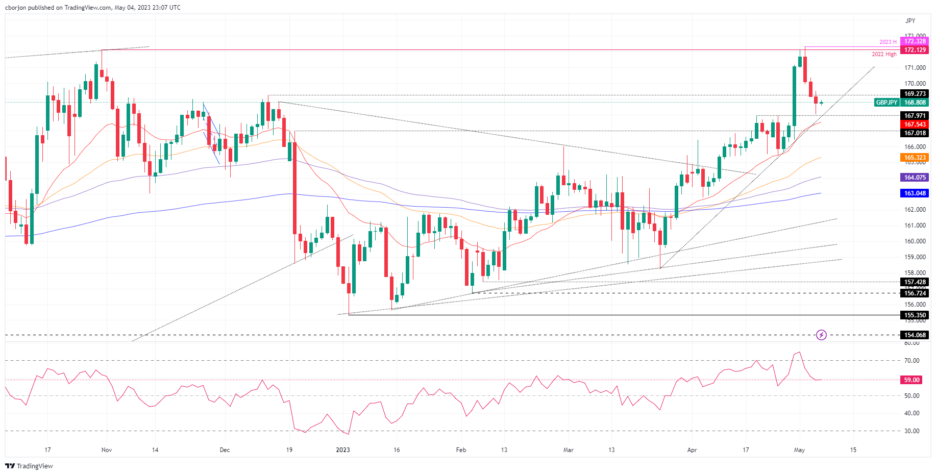 英镑/日元仍然偏向上行,即便价格从年初至今(YTD)的高点172.32跌向测试4月19日周期高点167.97的 标题:英镑/日元价格分析:中断三日连跌,多头指向169.00